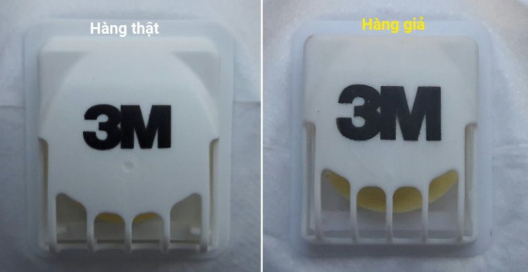 – Logo 3M trên valve thở ra: trên hàng giả, kích thước logo 3M to hơn khoảng 1/3 so với trên hàng thật.